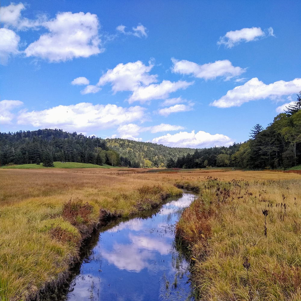 橋の上から反対側、大江湿原を見ます。ちょうど雲が出てきて、それが川の静かな水面に写りこんでとても綺麗でした。