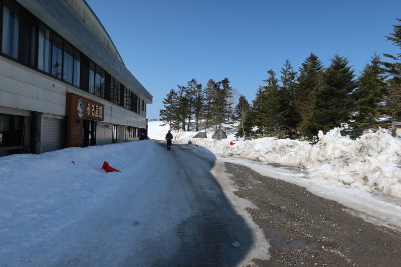 ふるさと館で有料トイレ借りて、雪仕度して歩き出すも、すでに地面見えてるー。今年は雪少ないって本当なんだな。