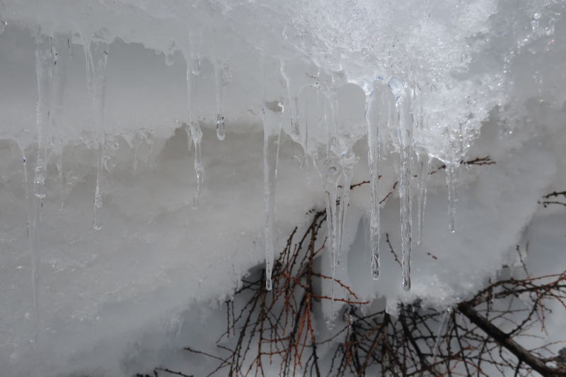 道の両脇に重ねられた除雪された雪が溶けてつららが。
