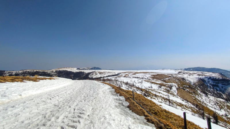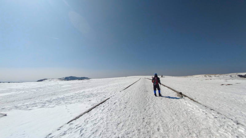 時間的には14:30時過ぎて、山時間としては下山してないいけない遅い時間なんですが、美ヶ原は台地なので、通常の山より日射時間が長いんです。懸念の和田峠も雪無かったから下り道も大丈夫そうなので、日の傾いてきた雪原をゆっくり戻ります。それこそ夕日を見てもいいくらいの心持ちで。