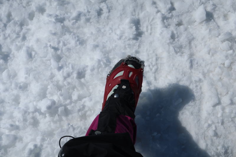 気持ちいいわ~。柵内の道の上の雪は踏みかためられてるので、チェーンスパイクで問題なし。