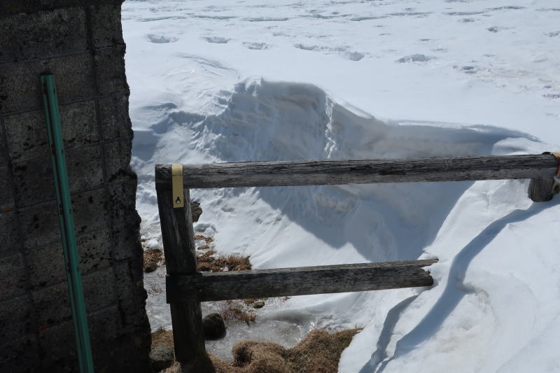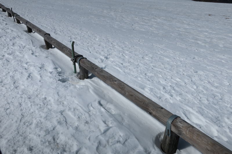 夏は寄りかかった柵が、冬は足元に埋まってる。雪の深さがわかる。