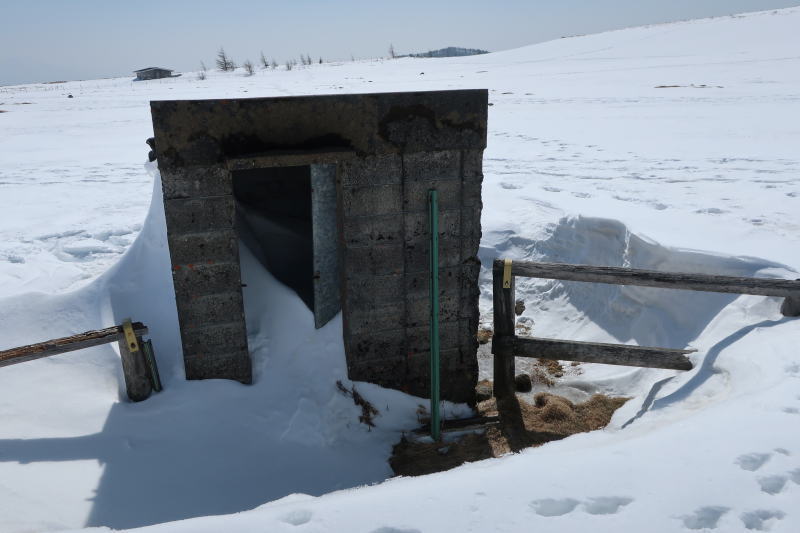 石造りの放牧の物置小屋、ここだけ、周囲の雪が溶けてる。