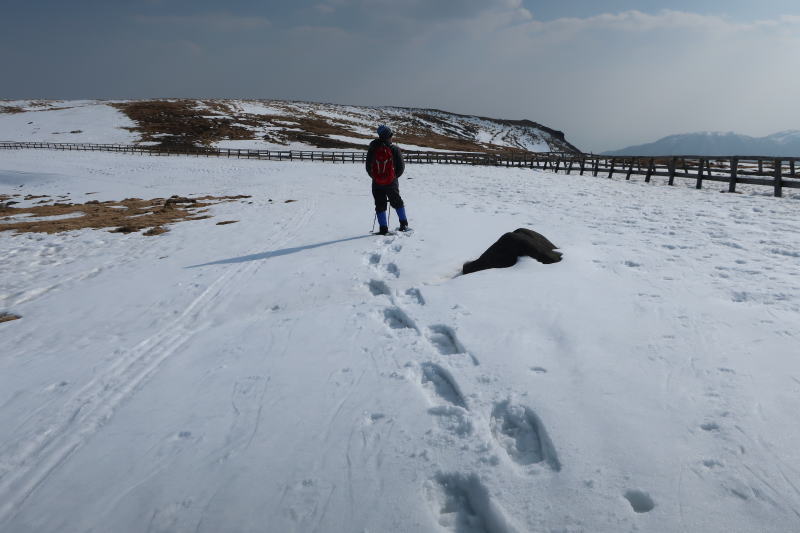 で、和田峠に雪がない=美ヶ原も雪少なめで、すでに地肌が見えてるところ多数。雪も腐り気味で、スノーシューでも踏み抜きます。いい雪質は王ヶ鼻あたりのみかなー。