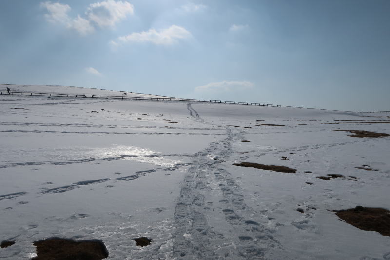 美しの塔から王ヶ頭ホテルまでの道は、スノーシューツアー用の雪上車が通るからか、雪が汚く水を含んで滑って、チェーンスパイクでは歩きにくかった。